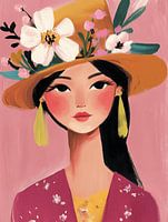 Een portret vol zomer en levenslust – een stijlvolle vrouw met een hoed vol bloemen, die straalt van vrolijkheid en charme. De roze achtergrond en speelse details geven dit werk een lichte, luchtige sfeer, alsof je een zonnige dag vol bloemen en vrijheid binnenstapt. Perfect voor iedereen die houdt van kleur, elegantie en een vleugje…