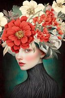 Surrealistisch portret van een vrouw met een haartooi van bloemen.