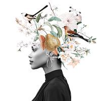 Een digitaal vervaardigde collage, opgebouwd uit een digitaal vervaardigde illustratie van een vrouw, gecombineerd met diverse vintage botanische afbeeldingen.