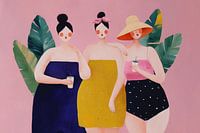 Zomer in haar meest vrolijke vorm: drie elegante vrouwen in badpak, gewapend met een cocktail en een flinke dosis zelfvertrouwen. Tegen een achtergrond van tropische bladeren en roze zonsondergang vibes, vieren ze vriendschap, vrijheid en frisdrank met een rietje. Deze speelse ode aan de zomer viert lichaam, lef en lol. Want wie zegt dat je een bikinibody nodig hebt om volop van de zomer te genieten?