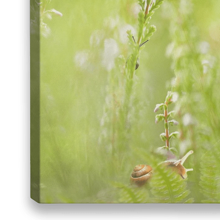 Vrolijke zomerse afbeelding van oranje vlinders tussen heideplanten en varens. Er kruipt ook nog een slakje rond tussen het groen.