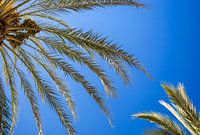 Wuivende palmbomen tegen een strak blauwe lucht. Foto is gemaakt op het Spaanse Eiland Mallorca.