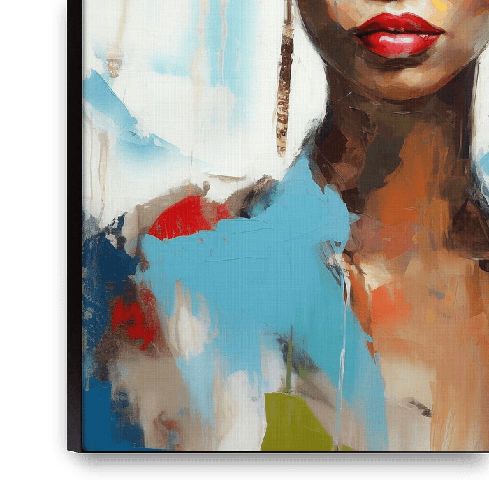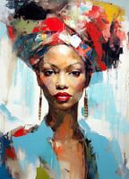 Kleurrijk portret van een mooie vrouw in een Impasto verfstijl met grove penseelstreken op canvas in voornamelijk lichtblauw en rood tinten.