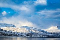 Sneeuwstormen trekken over de koude bergtoppen langs een fjord in Noorwegen.