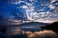 Zonsopgang boven Sun Moon Lake in Taiwan. De zon komt op aan de top van de berg.