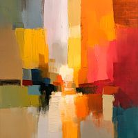 Een abstract kunstwerk met levendige kleurvlakken, de compositie heeft een gestructureerde, gelaagde uitstraling, met lichtere tinten in het midden die licht of een centraal punt suggereren omringd door donkere tinten en overlappende vormen die diepte creëren. De stijl is expressief en modern, met de nadruk op felle kleuren en geometrische vormen.