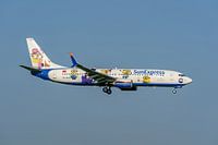SunExpress Boeing 737 met Minions livery vlak voor de landing op de Aalsmeerbaan van luchthaven Schiphol gefotografeerd.