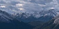 Zicht op de met sneeuw bedekte toppen van de ruige Sundance Range in de Canadese Rockies ten oosten van Canmore, Kananaskis Country, Alberta op een bewolkte dag in de herfst met dichte naaldbossen op de hellingen, gezien vanaf Ha Ling Peak.