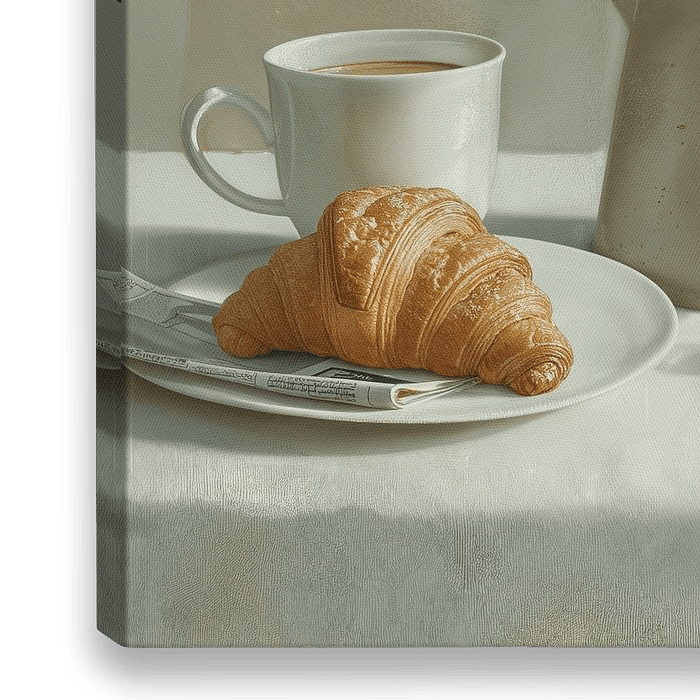 Sunday Serenity - Dit stilleven schilderij toont een sfeervol ontbijttafereel met een witte koffiekop gevuld met koffie, een elegante, beige theepot, een goudbruine croissant op een wit bord, en een klein potje jam op een eenvoudig licht tafelkleed; het speelt met licht en schaduw om een rustig, uitnodigend moment vast te…