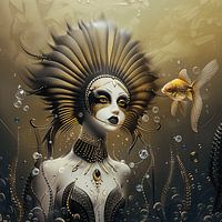 Deze intrigerende serie met als titel "Sunflower Queen and the Goldfish" is ontstaan door het combineren van verschillende afbeeldingen en hier een mix van te maken. Dit resulteerde in dit elegante en koninkelijke karakter van een vrouw in een surreal, abstract en expressionistisch stijl.