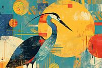 Sunlit Avian Grace - Dit dierenschilderij toont een majestueuze reiger in een abstracte, kleurrijke setting, waarbij de vogel scherp afgetekend staat tegen een achtergrond van geometrische vormen en een warm palet van oranje, geel en blauw.