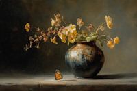 Sunlit Yellow Bloom and Butterfly - Dit bloemen schilderij is een japandi stilleven met een ronde patina-blauwe vaas vol losse gele bloemen die nonchalant over de rand hangen en een klein oranje vlindertje op de tafel naast de vaas, een warm en realistisch bloemen schilderij dat als schilderij bloemen perfect staat in een modern…