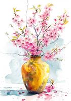 Aquarel van een stilleven van roze kersenbloesems op een okergele vaas. Nat geschilderd met watertechniek en spatten. Diverse tinten roze. Impressionistisch geschilderd. Passend bij diverse stijlen en trends, waaronder pastel, bloemen, Japandi en kersenbloesems. Artist: Bianca ter Riet