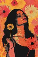 Zomerse afbeelding van een vrouw met zwart haren, een zwart hemd en zwarte omlijsting tegen een rood, oranje en gele achtergrond, voorzien van bloemen in een complementaire kleurstelling. Zomers, vrolijk en intens. Genietend van de zon en de zomerse geuren. Passend bij diverse stijlen en trends, waaronder, portret, vrouw, zomer, oranje.…