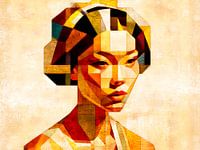Sunny Geisha, een modern abstract portret van een Japanse vrouw, geïnspireerd door het kubisme en de Bauhaus-geometrie en films uit de jaren 20 tot 60.
