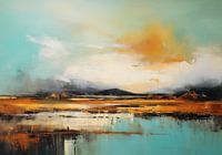 Kleurrijke afbeelding van een prachtig roestbruin landschap met azuurblauw water en de gele zon boven de witte wolken in mooie complementerende kleuren. Abstract, subtiel en ruig. Passend bij diverse stijlen en trends.