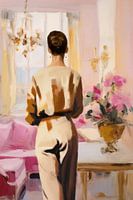 Digitaal vervaardigd portret van een vrouw, in haar kleurige en zonnige woonkamer.