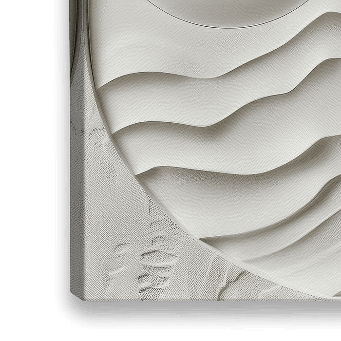 Modern abstracte afbeelding van de zon en golven. Driedimensionaal met mooie organische ronde vormen. Prachtige contrasten die tot de verbeelding spreken. Een afbeelding in mooie wittinten, wat voor een rustig geheel zorgt. Passend bij diverse stijlen en trends, waaronder modern abstract, wit, zomer, Japandi. Artist: Bianca ter Riet