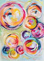 Zomerse zwevende zeepbellen in zoete kleurtjes. Je kunt alleen al door de beschrijving zachtjes wegdommelen bij dit vredige tafereeltje. Met wilde losse penseelstreken schilderde ik intuïtief deze vormen, waarbij een vrolijke sfeer ontstond die je meeneemt. Naar buiten. Naar zon en warmte. Naar de herinnering van spelen met zeepbellen.…