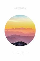 Hier zie je een landschap schilderij in een ronde vorm tegen een witte achtergrond. Bovenin het design staat de plaats en land vermeld en onder het design een mooie quote.