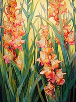 Sunrise Symphony in Bloom - Dit gladiool schilderij toont een levendige verzameling van oranjeroze gladiolen, badend in warm ochtendlicht, omgeven door hun stevige groene bladeren.