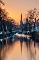 Zonsopkomst in Delft met de Oostpoort op de achtergrond.