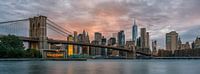 Een mooie kalme zonsopgang in Ney York. De opkomende zon schijnt haar licht op de wolken boven Manhattan en reflecteert op het glas van de hoge bebouwing.