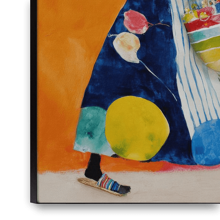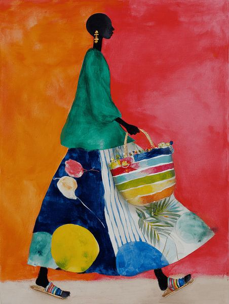 Een krachtige, kleurrijke ode aan beweging en vrijheid: een elegante vrouw in profiel, gehuld in smaragdgroen en diep indigo, wandelt door een warme gloed van oranje en rood. Haar grote gestreepte tas lijkt gevuld met een kleine wereld aan zomer — bloemen, kleur en levendigheid — terwijl grafische vlakken en botanische details het beeld…