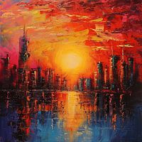 Een vurige zon zakt achter de stad. Rood, oranje en blauw vloeien samen in een expressieve skyline vol energie en licht. Een krachtig en sfeervol werk dat iedere ruimte laat stralen.