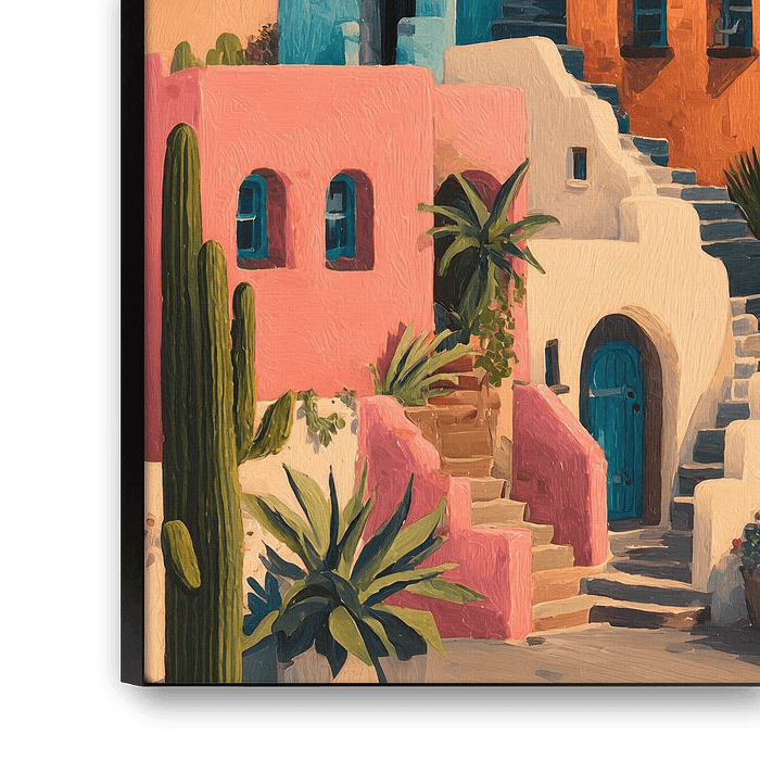 Een levendig schilderij van mediterrane huizen in warme kleuren. Roept het gevoel van zwoele zomeravonden op.