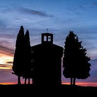 Zonsondergang bij Cappella della Madonna di Vitaleta in Toscane. Tussen Pienza en San Quirico in de Val d'Orcia in Midden-Italië.