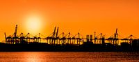 De zon gaat onder achter een rij containerkranen in de haven van Rotterdam. Ik heb het contrast lekker verhoogd om de kranen als silhouet weer te geven.
