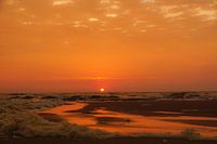Zon die onder gaat boven zee met de warme kleuren, de contouren van het zand wat het iedere keer weer tot een magisch en mystiek schouwspel maakt.