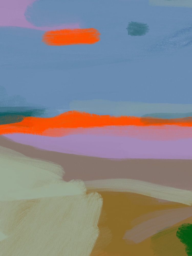 Deze digitale tekening hoort bij een serie die ik maakte ter voorbereiding en onderzoek van een groot schilderij dat ik wilde maken. Ik was hierbij vooral op zoek naar een kleurenpalet waarin ik feloranje en vergrijsde tonen kon combineren, om de zonsondergang er echt 'uit' te laten knallen.