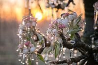 De prachtige Betuwse bloesem gehuld in een jasje van ijs. Dit doen de fruittelers om de knoppen van de bloesem te beschermen tegen het kapot vriezen.
