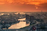 De zon gaat onder in rotterdam met de coolhaven op de achtergrond.