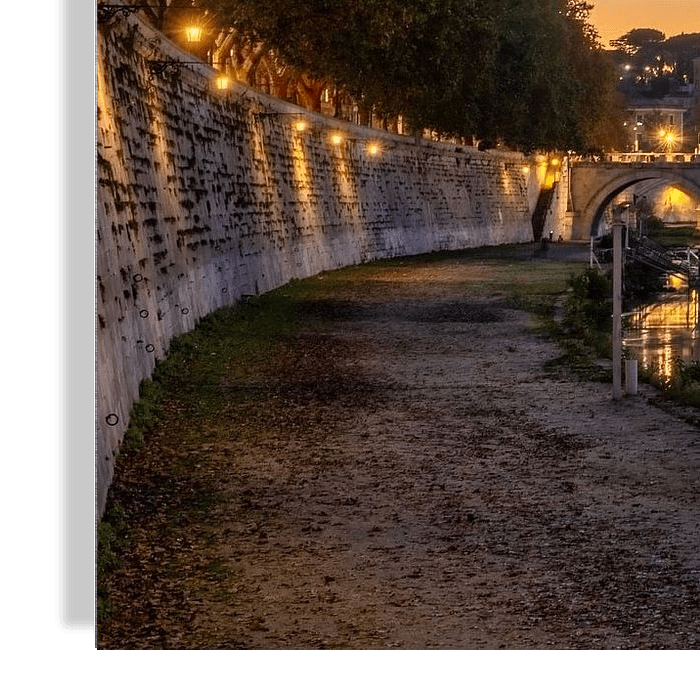 Aan de rand van Tiber heb je een mooi zicht op de Sint-Pieter Basiliek en de Pont Sant'Angelo tijdens zonsondergang.