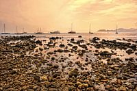 Coucher de soleil sur un littoral rocheux méditerranéen.