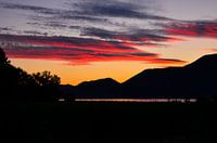 De zon is net onder achter de bergen rond het Iseomeer in Italië. De wolken kleuren prachtig rood, roze, oranje en paars.