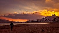 Het strand van Altea aan de Costa Blanca levert vaak prachtige zonsondergangen op. De lucht met enorme wolken kunnen dan helemaal rood of oranje kleuren. Zelfs de kleur van de zee verandert mee! De late wandelaar en de volgels maken de foto af.