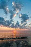 De zon gaat onder na een zwoele warme dag. Het zeewater is heerlijk warm en de golven zijn vlak. Wolken trekken langs de horizon als een vaarwel naar de dag.