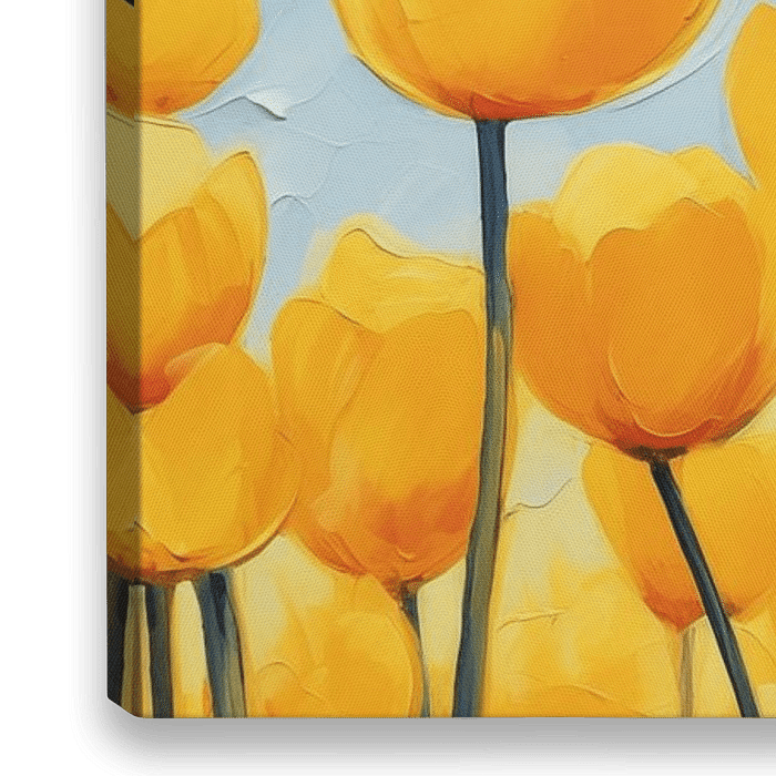 Vrolijke gele tulpen in een veld onder een lichtblauwe lucht.