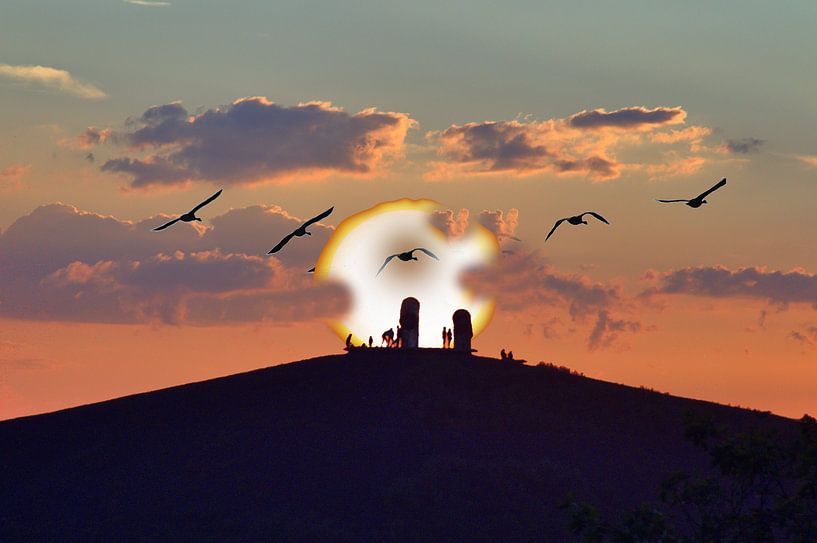Fotomontage met de ondergaande zon op de Rungenbergse slakkenberg in Gelsenkirchen, met de 2 lichtkanonnen op de top van de hoop en kleine herkenbare mensen
