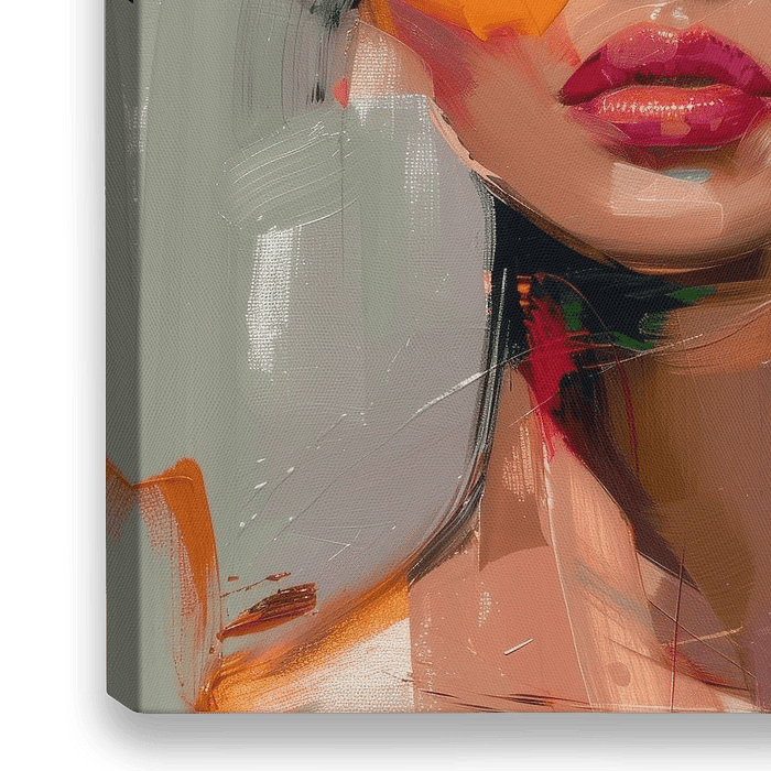 Super kleurrijk modern en abstract portret van een jonge vrouw met verfstrepen over haar gezicht. Een bijzondere blikvanger voor je interieur! Voor wie van kleur houdt! In de kleuren paars, oranje, roze, groen en okergeel.