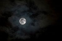 Grote volle maan schijnt door een gat in de wolken in de winter