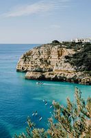 Suppers bewegen zich langs de imposante kliffen van de Algarve. De menselijke schaal geeft het landschap dynamiek en maakt het beeld levendig en toegankelijk.