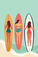 Een stijlvolle illustratie in minimalistische retro stijl toont drie surfsters van achteren gezien, elk op hun eigen karakteristieke surfplank in warme zomerse kleuren. De surfplanken in oranje, koraal en wit contrasteren prachtig met de mint-groene achtergrond en beige zandstrand, wat een rustgevende strandstemming creëert met een vleugje nostalgie en female empowerment.