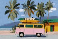 Een roze-geel retrobusje met surfplanken op het dak, palmbomen die loom wiegen in de wind en een zomerse vibe die je spontaan je schoenen laat uitschoppen — welkom op een zonovergoten stranddag in Brazilië. Dit werk barst van de good vibes: je hóórt bijna de zee ruisen en de flipflops flappen.