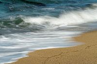 Gedetailleerd beeld van een golf die uitloopt op een zandstrand, de blauwe kleur van de lucht wordt weerspiegeld in het water, waterbeweging in discrete lange tijd blootstelling - Locatie: Caraïben, Kleine Antillen, Eiland Guadeloupe
