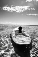 Er ontvouwt zich een stil spel tussen mens en zee. Het glinsterende wateroppervlak weerspiegelt de zon, terwijl de surfer vastberaden op zijn board ligt. Omringd door de uitgestrektheid van de oceaan nodigen zachte golven je uit om te ontspannen en het contrast tussen schaduw en licht vertelt over een dorst naar avontuur en innerlijke rust.